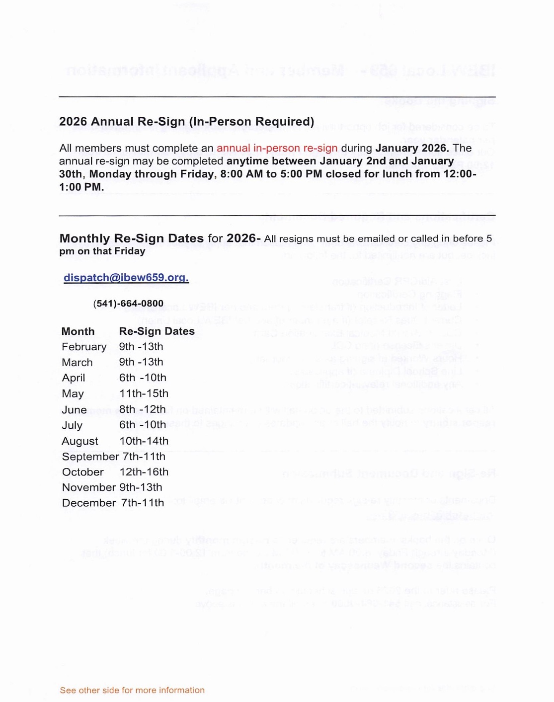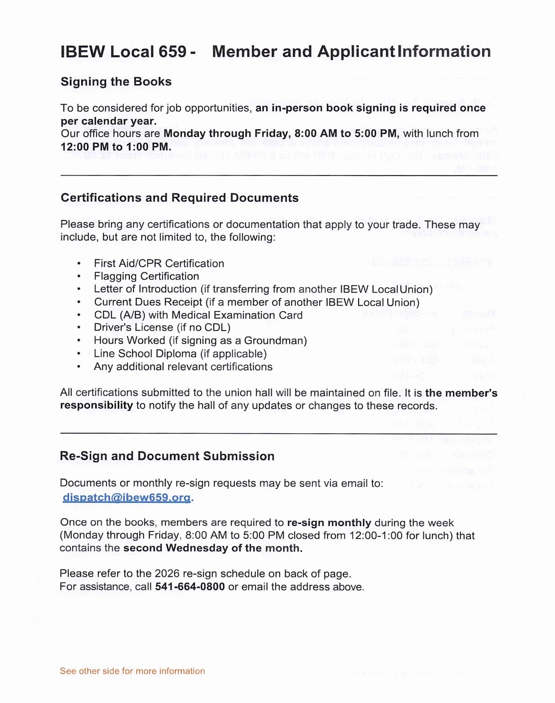 The IBEW 659 Member Portal allows you to check your status on the books and show any open calls. Also, IBEW 659 members can pay your basic dues and update your mailing address and phone number. Username: email Password: Last name last 4 of social security number *Note: when signing in for the first time, you will be asked to update your password. IF CALLING FOR A WIREMAN DISPATCH, Please call 541-664-0802 to leave a message. New calls left on hotline daily. If calling about an open call on this web page, leave your contact info.